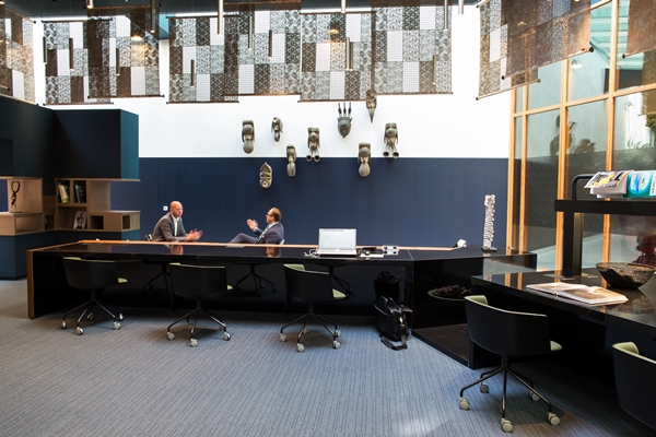 Dit vertaalt zich in het gebruik van ‘authentieke’ materialen als leer, kokos en hout. Daarnaast wordt gebruik gemaakt van kleuren met natuurlijke pigmenten. De kleding van het personeel en de opvallende signing door het pand sluiten hier op aan. Markant zijn verder de bibliotheek in de open werkruimte en de Tribes Table, waar net als bij stammen aan een ronde tafel vergaderd wordt.