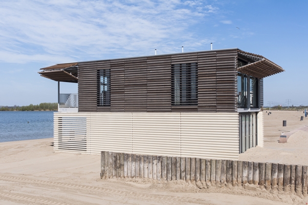 Voor de strandwacht bij de Zevenhuizerplas in Rotterdam is een gebouw aan de boulevard gerealiseerd. Het ontwerp van