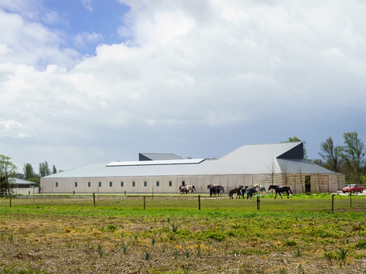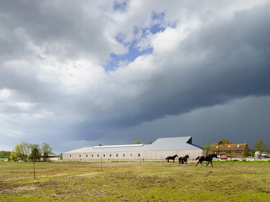 Het paardenpension bevindt zich achter de historische bebouwing van boerenerf Ons Genoegen. Het gebouw heeft zelf ook een rurale verschijningsvorm met een opklimmend daksilhouet. Het beperkte materialenpalet van vergrijsde houten gevels en een stalen roevendak versterkt het abstracte karakter van het gebouw tegen een achtergrond van Hollandse luchten.