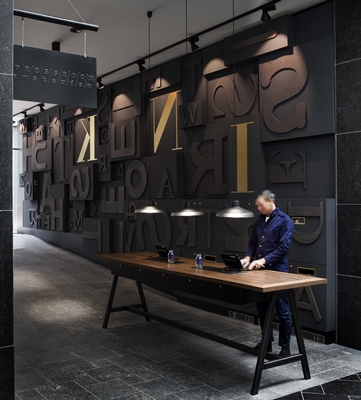 De steeg loopt door en langs de belangrijkste hotelfuncties op de begane grond. Ook zijn twee patio’s geschapen door twee dakelementen van een latere uitbreiding weg te nemen. De wanden van de steeg zijn gedecoreerd met ‘drukletters’ die een anagram vormen met daarin de naam van het hotel en diens motto: