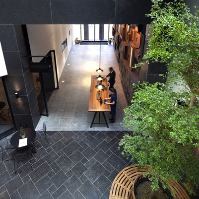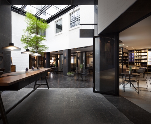 Vloeren en wanden zijn afgewerkt met natuursteen, baksteen en stukwerk van beton. De bezoeker zal de receptie eerder ervaren als een ‘poort’ naar het hotel voelen dan als een strikte scheiding met het informele gedeelte, belooft concrete. Het mengen van gasten en niet-gasten is namelijk een belangrijk doel van de opzet van de begane grond.