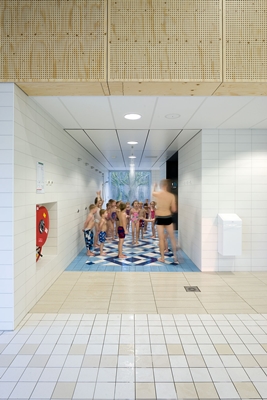 Aan de binnenzijde zijn de gekromde (plafond)vlakken bekleed met hout. In combinatie met witte accenten ontstaat zo een frisse, neutrale uitstraling. De compacte en transparante opzet zorgt ervoor dat het gebouw goed te overzien is.