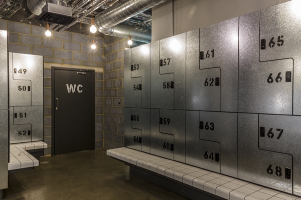 Ook de kleedkamers tonen het contrast van de rauwe industriële omgeving en luxe design. Zo is in de mannenkleedkamer enerzijds een oude betonnen liftschacht in het zicht gebracht en zijn er anderzijds kluisjes uit gegalvaniseerd staal en ledlampen in koperen fittingen. Tegenover de spiegels in Hollywood-stijl staan kappersstoelen uit de jaren 1950. De betegelde banken zijn verwarmd en in koelkasten liggen handdoeken.