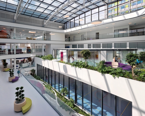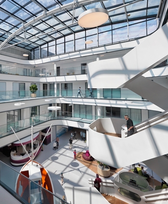 Het interieur van de verschillende volumes, waaruit het complex is opgebouwd, kent centraal gesitueerde atriums. Bruggen verbinden de beide zijden; niet alleen functioneel, maar ook symbolisch. De bruggebieden zijn een ontmoetings- en aankomstpunt voor de diverse ziekenhuisafdelingen.