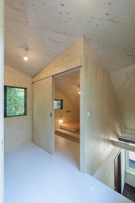 Vanuit de bestaande woonkamer klimmen de gebruikers via een hangende trap naar de nieuwe ruimte. De uitbreiding biedt plaats aan twee slaapkamers en een overloop met wasmeubel. De overloop geeft toegang tot het bestaande dak, dat al geregeld werd beklommen om te genieten van het uitzicht.