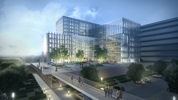 Een glazen huid met verticale geleding verbindt de verschillende onderdelen tot een geheel. Bestaande inhammen zullen op deze manier verworden tot vides. In de oudbouw is de verhouding van transparante en gesloten geveldelen 3:1, terwijl de uitbreiding hogere verdiepingen heeft met een open-dichtverhouding van één op één.