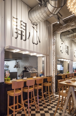 In de aangrenzende ruimte staat een bar van gegalvaniseerd staal, met daarboven een flessenrek met dranken uit verschillende Aziatische landen. Twee eiken wandrekken aan weerszijden van de bar zorgen voor extra opslagruimte. Om de producten te presenteren met een ‘twist’, zijn de vakken zijn 45 graden gedraaid. Op ieder rek staat in neonletters de naam van het restaurant.