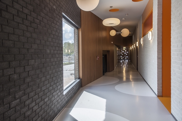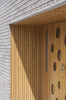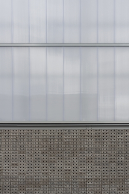 Voor het metselwerk is een licht gesmoorde steen gebruikt, die klamp is vermetseld in tegelverband. Speciaal voor dit project is de frog vervangen door twee verdiept liggende ronde sparingen. Dit geeft de gevel een subtiel patroon van beschaduwing, contrasterend met de opake gevel van polycarbonaat, leggen de architecten uit.