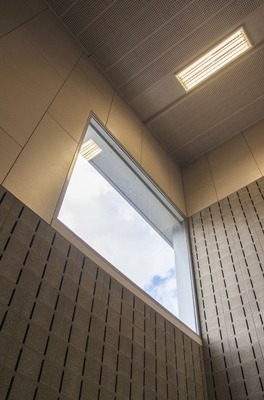 Op diverse posities zijn raamopeningen gemaakt. Grote hoge ramen onder het plafond laten het daglicht vanuit het noorden binnen, wat van waarde is voor het bewegingsonderwijs. Lage ramen, dichter bij de grond, tonen de activiteiten binnen, terwijl de sporters geen hinder van het licht ervaren.