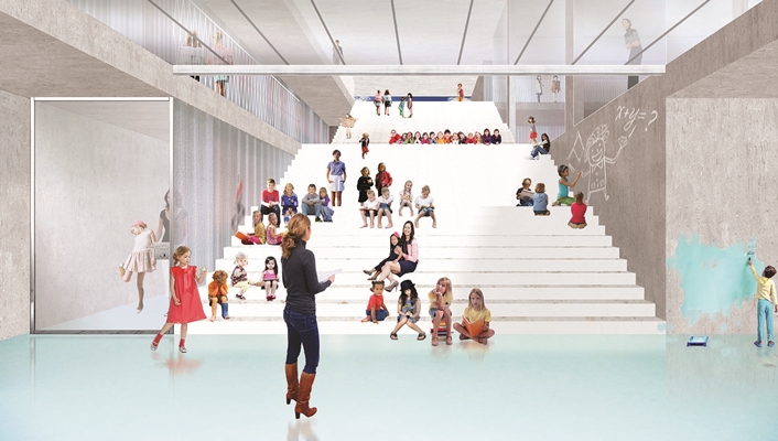 In het ontwerp brengt het architectenbureau het programma onder in een compact volume van 40 bij 31 meter. De diverse functies - kinderdagverblijf, basisschool, buitenschoolse opvang en de sporthal voor zowel de school als de wijk - worden verdeeld over de vijf verdiepingen van het gebouw.