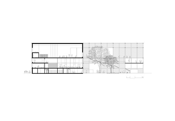 Aan de kant van de buitenruimte is de constructie bedekt met een metalen gaas, voorzien van vegetatie. Uit deze groene wand is een aantal ramen gesneden. Aan de kant van de binnenruimtes is de gevel ontworpen als een patchwork van open en dichte vlakken. Daardoor behoudt men van binnenuit zicht op het naastgelegen plein, de straat, de kade of het park.