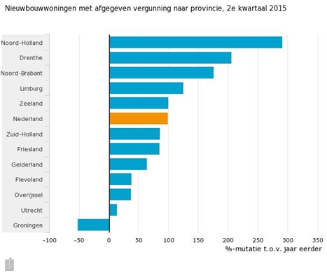 In bijna alle regio's is daarbij sprake van een stijging, hoewel de verschillen groot zijn. In Noord-Holland was de groei in het aantal afgegeven vergunningen het sterkst (291 procent), gevolgd door Drenthe (206 procent). Ook in Noord-Brabant en Limburg was sprake van meer dan een verdubbeling van het aantal vergunde nieuwbouwwoningen.