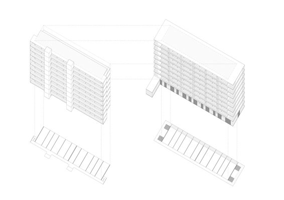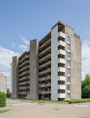 De opdracht betreft twee brutalistische woonschijven uit de jaren zeventig van de vorige eeuw. Bij het ingrijpende herontwerp dat Atelier Kempe Thill in samenwerking met het Antwerpse bureau