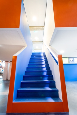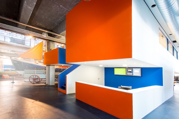 De architecten kozen bewust voor een contrast tussen het bestaande gebouw en de toevoeging. Het nieuwe volume is helder wit het blauw en oranje van de KNRM als accenten. "Ze vormt letterlijk een brug tussen het oorspronkelijke gebouw en de aanbouw uit 2003", aldus Bergevoet.