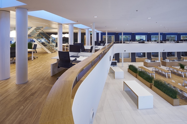 Het visitekaartje en het hart van het gebouw is het nieuwe atrium, dat de verschillende bouwdelen verbindt en de communicatie tussen de afdelingen moet bevorderen. Dat laatste geschiedt via trappen en vides. Het gehele interieurontwerp is gebaseerd op een niet-plaatsgebonden werkconcept.