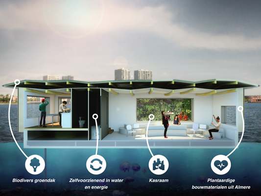 “Plantaardig gebouwd, dat is uniek voor een drijvend gebouw”, zegt Koen Kaljee, die de ark samen met Noëlle Dorenbos heeft ontworpen. “De Drijfveer wordt helemaal zelfvoorzienend: hij gaat energie opwekken, water zuiveren en afval verwerken.”