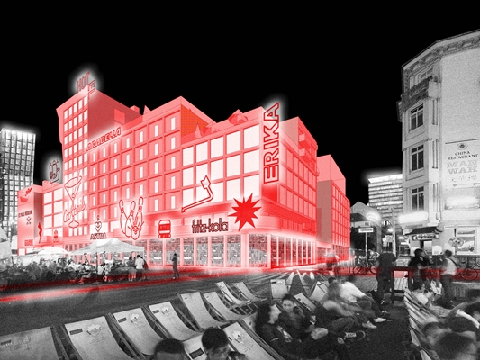 het winnende stedenbouwkundig plan gemaakt voor een grote kavel aan de Reeperbahn in Hamburg. Het ontwerp geeft invulling aan een programma van eisen dat in nauw overleg met de buurtbewoners is opgesteld.