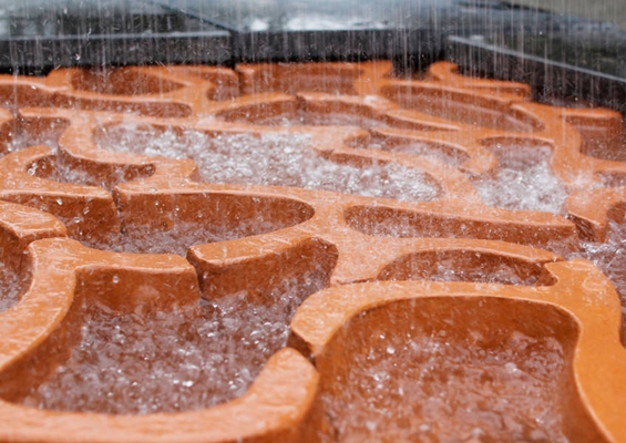 ontworpen patroon van golvend gevormde keramische straatstenen maakt deel uit van de Rain(a)way Garden Katshoek, die de wateroverlast in het Zomerhofkwartier moet helpen verminderen.