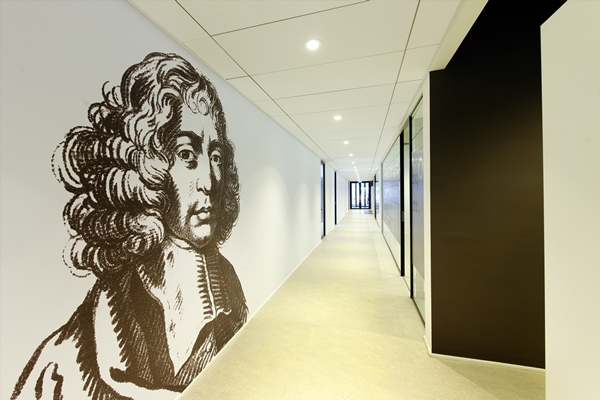Nieuwe toevoegingen, zoals plafondeilanden en wanden, zijn los gehouden van de gevel. Oud en nieuw zijn duidelijk afzonderlijk afleesbaar. Glazen wanden zijn voorzien van prints, gebaseerd op oorspronkelijke drukwerken van Spinoza's stellingen. Daarbij zijn de originele teksten afgedrukt naar moderne vertalingen in een eigentijdse letter. Een wand toont een portret van de zeventiende-eeuwse filosoof.