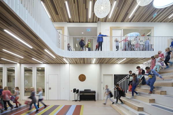 De gebruikers hebben ieder hun eigen plek, maar ze zijn eveneens alle aangesloten op het centrale hart van het gebouw. Dankzij vele doorzichten en andere ruimtelijke relaties zijn de gebruikers met elkaar verbonden. De speelpleinen zijn gerealiseerd in de oksels van het gebouw.