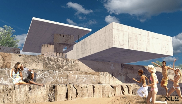 een installatie met kalksteenblokken gemaakt. De blokken zullen hierna worden gebruikt voor een paviljoen in Montrose Beach, eveneens ontworpen door NLÉ.