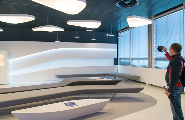 Met een paar extra drukken op de knop liet de gids zien welke andere opties er ook zijn. Met enige regelmaat verdraaiden hierbij grote delen van het plafond, om zo andere lichtbronnen naar voren te halen. Allereerst kan het lichtniveau natuurlijk omhoog, naar bijvoorbeeld 600 of 700 lux. Maar extra aanlichting van het plafond en de wanden vergroot de ruimtelijkheid ook aanzienlijk.