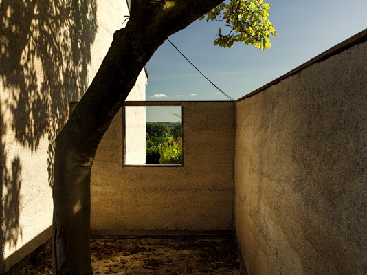 De ommuurde binnenplaats fungeert als buffer tussen de woning en de drukke Guilleminlaan. Ze wordt tevens gebruikt als terras. Aan de buitenzijde heeft het zomerverblijf een robuuste uitstraling gekregen door de afwerking met kalk-hennepbeton. Het materiaal verwijst naar de leemrijke aardlagen van de streek.