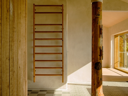 De kamers van de woning zijn georganiseerd als vier kwadranten rond een technisch blok met badkamer en toilet. De centrale positie van dit blok benadrukken de architecten door zijn vorm en materialisatie. Het taps toelopende volume is aan de buitenzijde bekleed met hergebruikt hout en aan de binnenzijde voorzien van witte geglazuurde tegels.