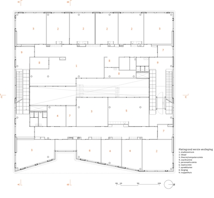 Het gebouw kent een splitlevel-opbouw, met een atrium als hart. Deze ruimte verbindt de zogeheten onderwijsteams met elkaar, die ieder een eigen plek rond het atrium hebben. Door de vloeren aan weerszijden van het atrium een halve verdieping te laten verspringen houden de teams zicht op elkaar en is het gemakkelijk ‘oversteken’.