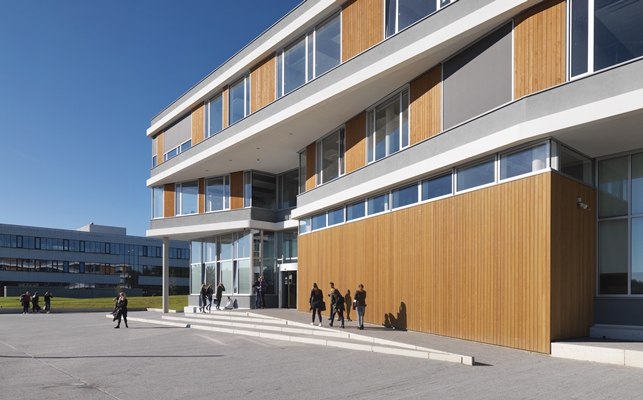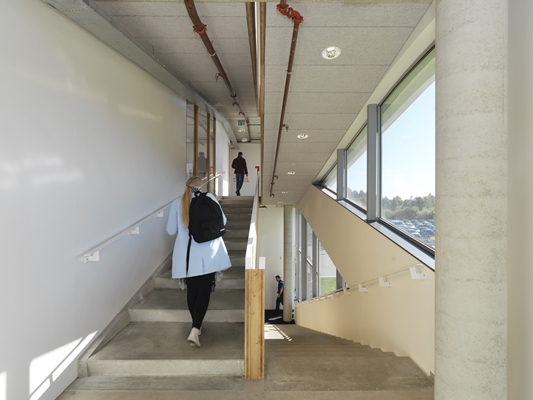 De overgang van buiten naar binnen is geleidelijk door de overstekken van de gevel en de trappartij die naar de entree leidt. Ook het atrium legt de verbinding tussen binnen en buiten, tussen opleiding en campus, ingebed in de glooiingen van de grasheuvels.