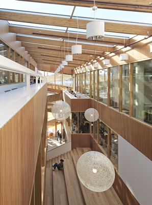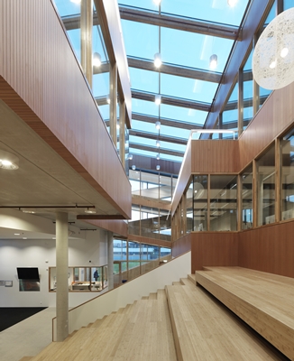 De vide zorgt voor een grote hoeveelheid natuurlijke lichtinval in het hart van het gebouw. Het gebouw voor Zorg en Welzijn wordt duurzaam verwarmd en gekoeld via een warmte- en koudeopslagsysteem in de bodem.