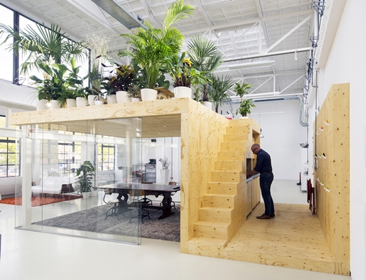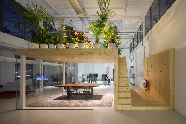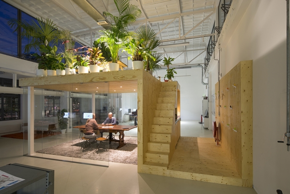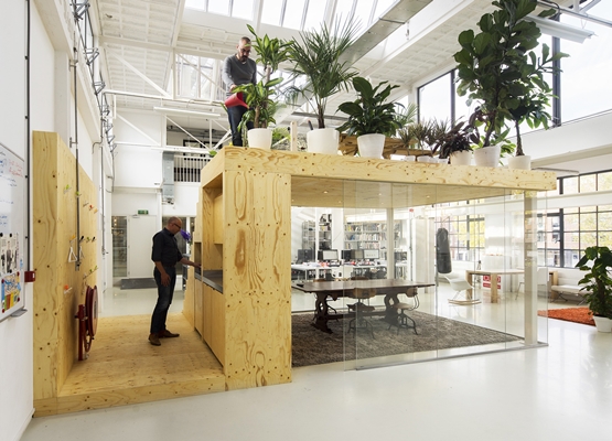De hoofdruimte van de Fabriek van Delfshaven in Rotterdam is herontworpen tot een open kantoorloft. Een houten bouwwerk met een vergaderruimte, pantry en daktuin vormt het centrale element in de ruimte. Het ontwerp is gemaakt door