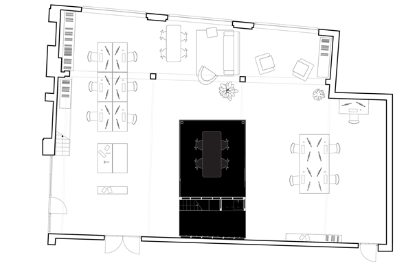 De vergaderruimte is akoestisch geïsoleerd van de rest van het open kantoor, waardoor er een ruimte voor private vergaderingen, telefoongesprekken en een kalme werkplek ontstaat.