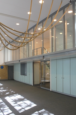Aan de voormalige gymzaal met een vrije hoogte van 5,5 meter is een entresol toegevoegd. Hierdoor hebben de architecten alle onderwijsondersteunende ruimten een plek kunnen krijgen. Onder de entresolvloer liggen onder meer docententoiletten, opslag- en serverruimte; boven zijn kantoren en behandelruimten voor medisch personeel gesitueerd.