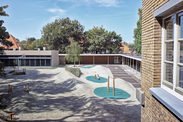 Het schoolplein ligt tussen hoofdgebouw en nieuwbouw. De vormgeving ervan zorgt voor verschillende zones - voor meer of minder activiteit - die worden afgeschermd door nieuw opgetrokken duinen, zo legt Nieuwe Architecten uit.