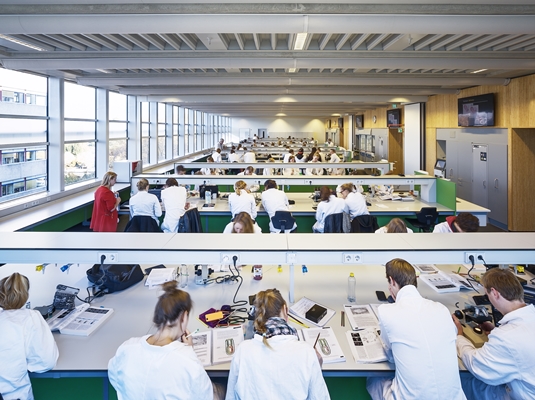 De hoger gelegen verdiepingen bevatten flexibel indeelbare practicum- en laboratoriumruimten. Die flexibiliteit is mogelijk door een slimme integratie van constructie en installaties, meldt Ector Hoogstad Architecten.