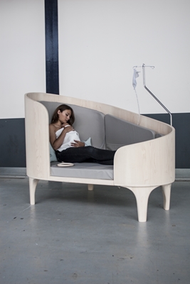 Bij de Graduation Show van de Design Academy Eindhoven tijdens de recente Dutch Design Week was een opvallend meubel te zien; Embrace houdt het midden tussen een bed en een bank met hoge leuningen. Het ontwerp van Ricky Kloosterman biedt een zachte en besloten plek voor ouders met hun te vroeg geboren kindje, een plek voor rust temidden van alle commotie op een neonatologie-afdeling.