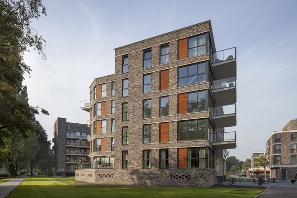 De steen past uitstekend met het groen van het park en gaat goed over in het glas van de vele raampartijen. In aanvulling op het metselwerk als basis is aan de parkzijde hout – Western Red Cedar – toegepast.