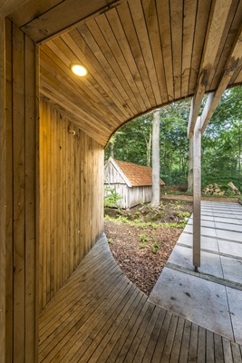De locatie voor de woning is een voormalige boomgaard tegen een bosrand. Uit de plek volgde de architectuur, legt Schreurs uit. De woning bestaat feitelijk uit twee delen. Het houten voorgedeelte, met de entree, ligt in de bosrand. De wand van houten latten maakt een golvende beweging.