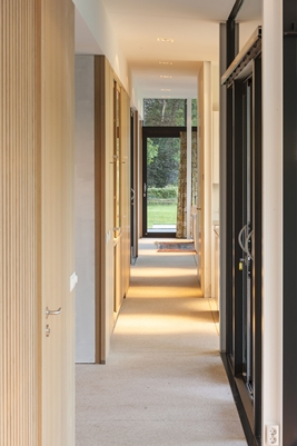 Het gehele huis kent lange zichtlijnen. Er is zicht van bos naar weiland en zicht over de hele breedte van de woning. De grote glazen toegangsdeur in de houten gevel biedt via de hal een doorkijk naar de patio, die weer uitkijkt over de tuin en de weilanden.