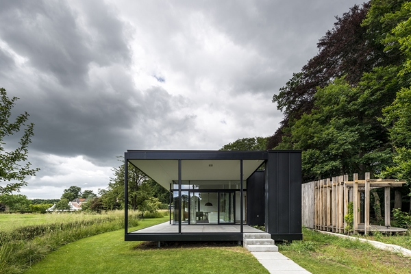 De andere zijde is het feitelijke woondeel. Dit bestaat uit een ‘zwevend’ volume, uitgevoerd in zwart staal en glas. Het woongedeelte biedt ruim uitzicht over de weiden; tevens zijn er aan deze zijde twee overdekte zitplekken. Van een afstand van deze zijde van de woning weg tegen de bosrand, aldus Schreurs.