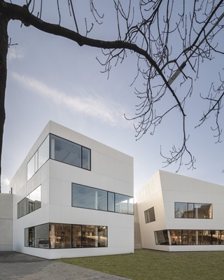 Het kleinschalige kantoorpand, met een oppervlak van 2.450 vierkante meter, biedt huisvesting aan diverse bedrijven in drie afzonderlijke paviljoens. Deze paviljoens zijn bekleed met panelen uit solid surface-materiaal en voorzien van structurele beglazing.