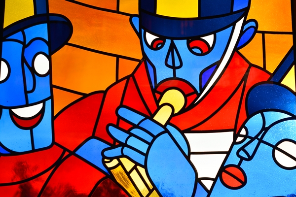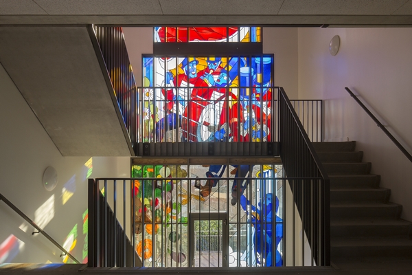 bevindt zich aan beide zijden van het trappenhuis. In het ontwerp zijn verwijzingen te vinden naar onder andere de Oostergasfabriek, het Sportfondsenbad en het Dierenasiel alsook naar persoonlijke verhalen uit de buurthistorie.