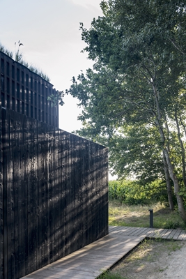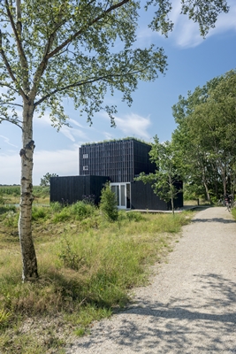 Het architectenbureau heeft de vier vakantiewoningen eenvoudig vormgegeven. De gevels zijn bekleed met inlands lariks dat is afgewerkt met een donkerkleurig, sterk impregnerend beschermingsmiddel. De verdieping moet in de loop der jaren begroeid raken.