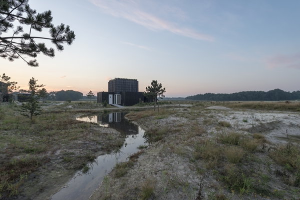 dlvz/ studio heeft de vakantieverblijven vormgegeven als vier meer of minder gesloten volumes. Door hun positionering ten opzichte van elkaar ontstaat ruimte, zoals in een bos een open plek kan ontstaan tussen de bomen en onder een bladerdak.