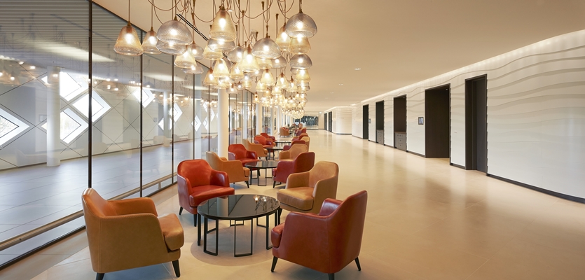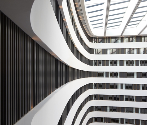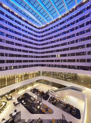 Binnen wordt de aandacht meteen gegrepen door het indrukwekkende atrium met een glazen plafond op 42 meter hoogte. Op de bovenste tien verdiepingen wordt de ruimte omgeven door de hotelkamers die aan de binnenzijde van de ‘ring’ liggen, terwijl zich op de lagere niveaus functies als vergader- en evenementenruimtes en een wellnessvoorziening bevinden.