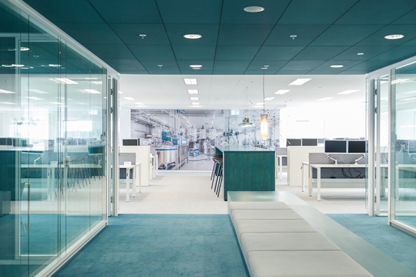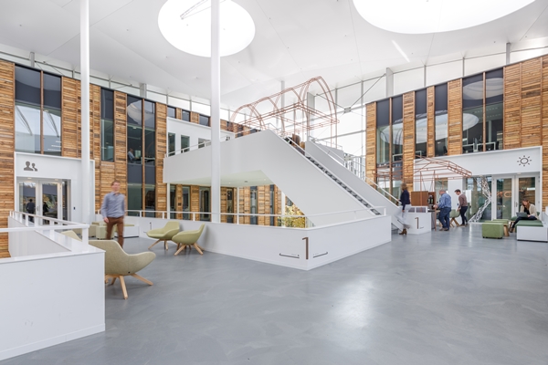“Daarom hebben we een centrale zichtas gecreëerd, die haaks op de entree ligt, zodat je bij binnenkomst meteen alle ‘bloedgroepen’ van het bedrijf in beeld hebt. Door het atrium kijk je helemaal tot in de werkplaatsen en laboratoria - die vroeger ergens achteraf verstopt lagen. Iedereen mag gezien worden, men mag trots zijn op wat hij doet – dat is het gevoel dat we willen bewerkstelligen”, aldus Fokkema & Partners.