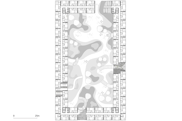 “In het plan verweven we de woningbouwblokken met deze Nolli Gardens. In het woongebouw voor studenten onderbreken deze ruimten de rationele circulatie en zorgen voor een ruimtelijke onderbreking en een programmatische verrijking als een collectieve eetkamer met keuken, wintertuin, bibliotheek, sauna etc. In het centrale gebouw is het de gemeenschappelijke ruimte die geprogrammeerd wordt met een piano, keuken, bibliotheek, et cetera.”