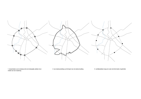 De oorspronkelijke muur was 1,70 meter breed, een maat die weergegeven zal worden via strips die van gevel tot gevel lopen en alle verharding doorsnijden. In de bronzen randen, ieder tien centimeter breed, zijn de namen van de poorten opgenomen. Het ontwerp wordt uitgevoerd in samenwerking met Haller Brun, Annika Devroe en Rotsmaatwerk.