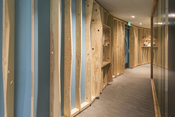 De iets meanderende structuur van het gebouw biedt vanzelf hoeken voor de verschillende functies. OTH heeft dit gegeven nog versterkt door schuine lijnen toe te passen. Wanden zijn zigzaggend in de ruimte geplaatst en ook in het vaste meubilair komen schuine lijnen terug. De blik van de gebruiker wordt hierdoor steeds verlegd, aldus de interieurarchitecten.